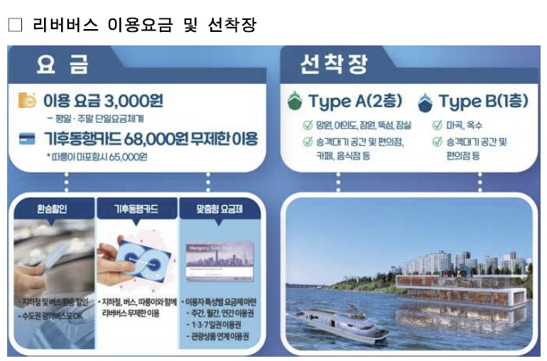 한강 리버버스는 마곡부터 잠실까지 총 7개 선착장을 오가고, 길이 35m, 폭 9.5m로 한번에 199명이 탑승할수 있고, 평균속력은 17노트(시속 31.5km), 최대속력은 20노트(시속 37km)입니다.