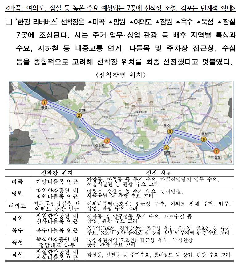 한강 리버버스는 총 7개 정류장을 지나갈 예정이고, 추가로 3곳만 정차하는 급행노선도 출퇴근시간에 운항예정입니다.