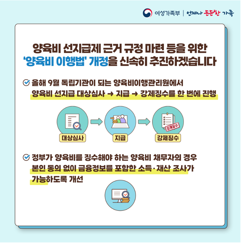 법원의 결정이 떨어지기까지 기간이 8개월~1년이 걸리는데 채무자가 이틈을 통해 재산을 처분하거나 명의를 이전하는 것을 방지하기 위해, 정부는 국가가 양육비를 선지급한 경우 채무자의 동의없이 금융정보를 포함한 소득, 재산을 조회할 수 있도록 양육비이행법 개정을 추진하기로 하였습니다.