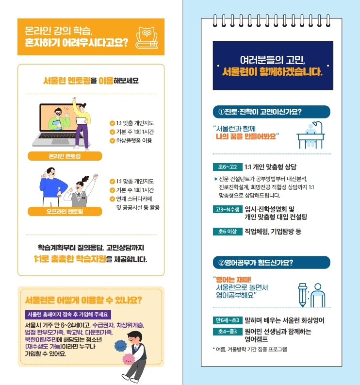 서울런에서는 초중고 학생이 가장 선호하는 온라인 교육 콘텐츠를 수강할 수 있고, 서울런 가입자 전원에게 온오프라인 멘토링 서비스를 제공하여 학생들의 효율적인 학습관리를 지원합니다.
