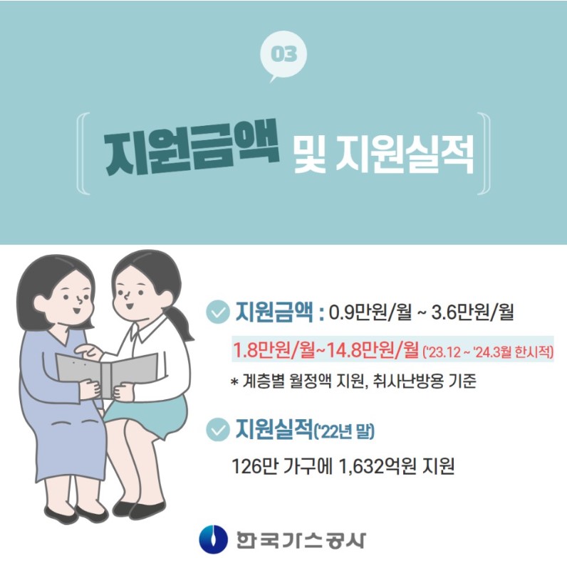 | 생계/의료 급여 | 3만 6천원 >>> 14만 8천원 | 단, 에너지이용권(바우처) 수급자일 경우 8만 6천원 |