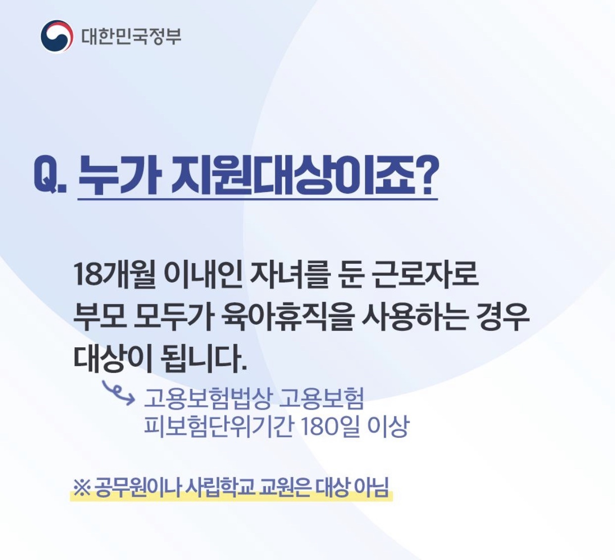 6+6 부모 육아휴직제도는 부모 중 남성들도 육아휴직을 쓰도록 유도하는 정책입니다. 부모가 같이 쓰거나 순차적으로 쓰게 될 경우 혜택을 받을 수 있습니다.